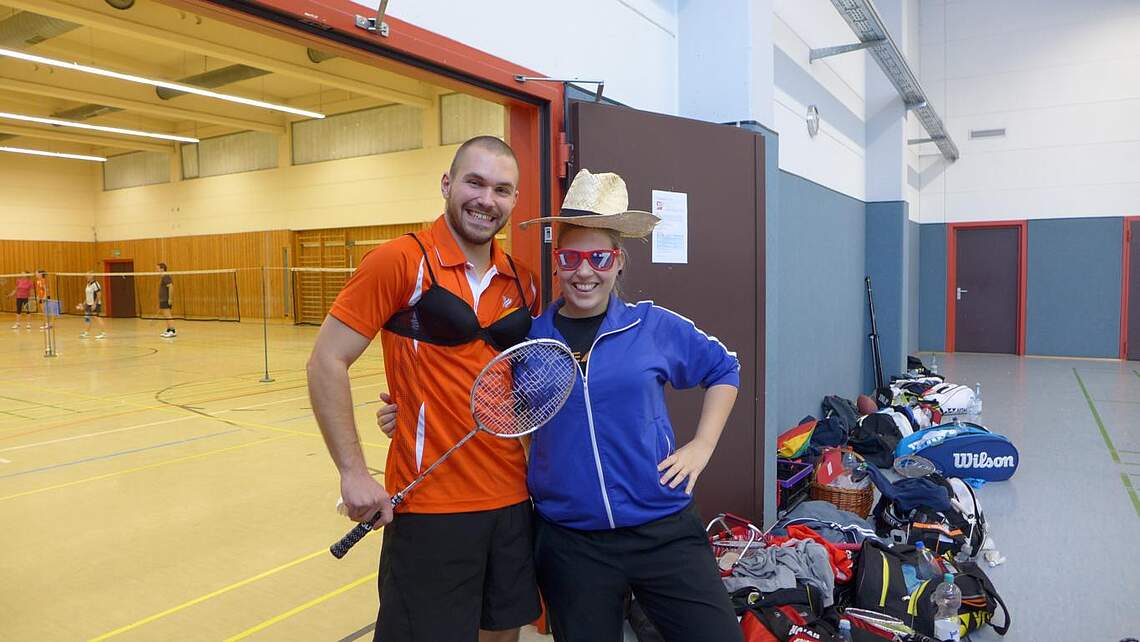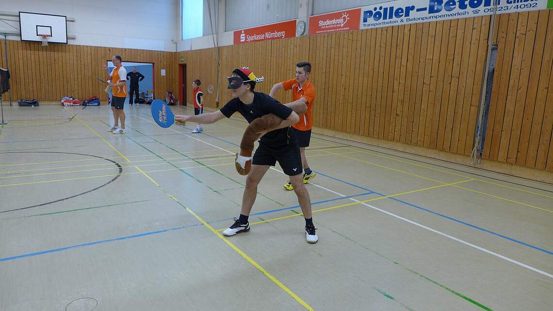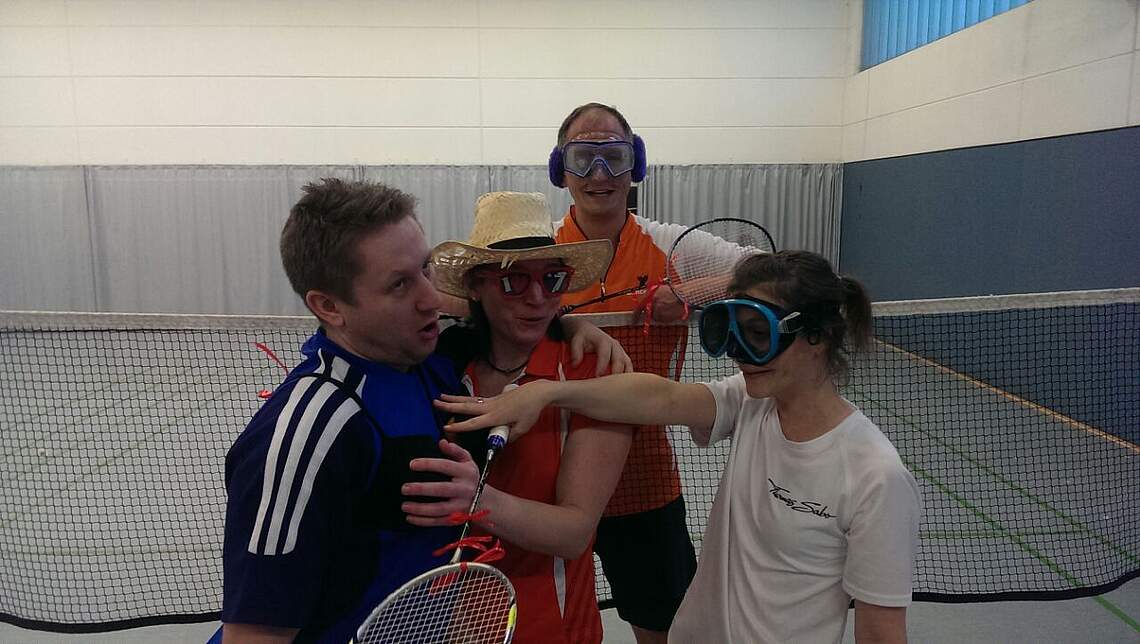 Das Highlight wartete am Ende auf die Teilnehmer. Beim erstmalig ausgetragenen Handicap Turnier wurden Doppelpaarungen aus je einem stärkeren und einem etwas schwächeren Partner zusammengelost. Der Stärkere von beiden wurde vom gegnerischen Team mit einem Handicap (Taucherbrille, Tischtennisschläger, Rollkoffer oder alles zusammen!!!) versehen, und so wurden 4 Runden Doppel mit je einem Gewinnsatz bis 21 gespielt. Es war eine Riesengaudi und der Spaß stand dabei eindeutig im Vordergrund!
