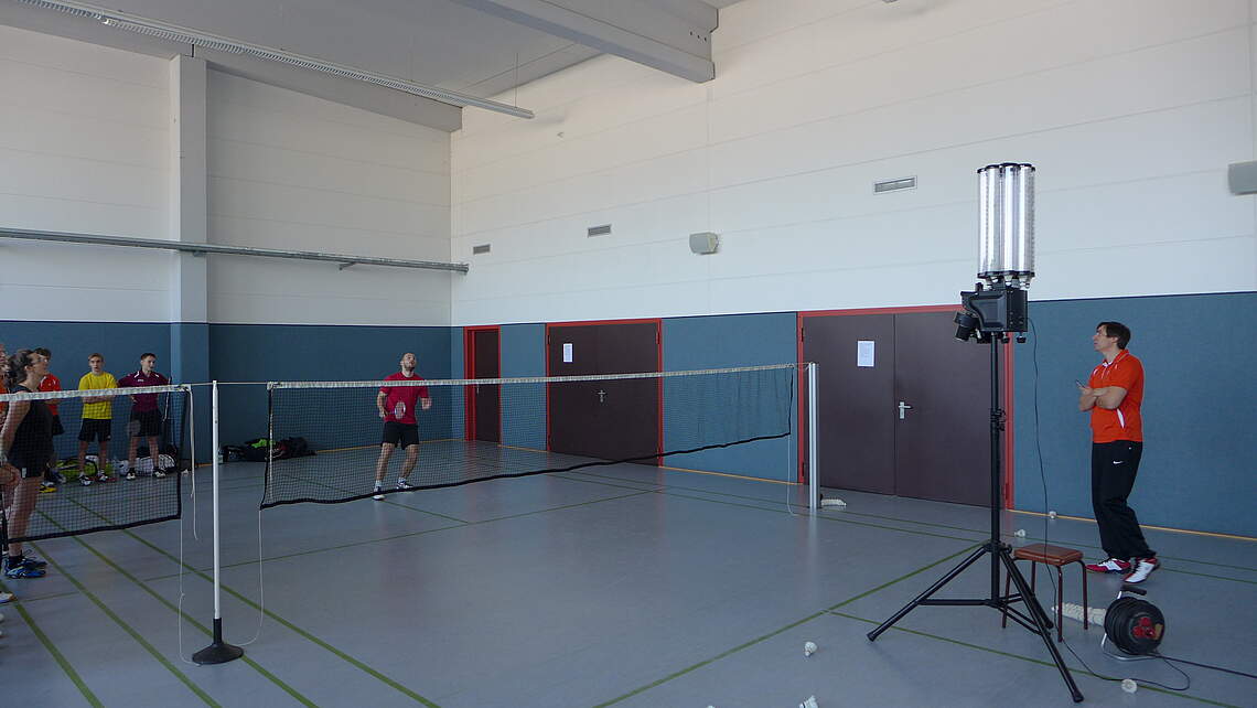 Nach gut einer Stunde durfte dann endlich der Schläger in die Hand genommen werden. In 4er-Gruppen durchliefen die Spieler 5 Stationen, die sich Jürgen zu den Themen Schlagsicherheit und frühe Ballannahme überlegt hatte. Hierbei kam auch die neu erworbene Ballmaschine „Ernie“ zum Einsatz, die wegen ihres präzisen Zuspiels (J) für große Begeisterung sorgte. Da man im Zeitplan etwas in Verzug geraten war, wurde die Mittagspause individuell gestaltet. Jeder aß kurz vor dem persönlichen Zusammenbruch, wobei manch einer diesen Moment verpasste und mit Übersäuerungsschmerzen bestraft wurde.