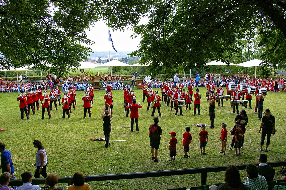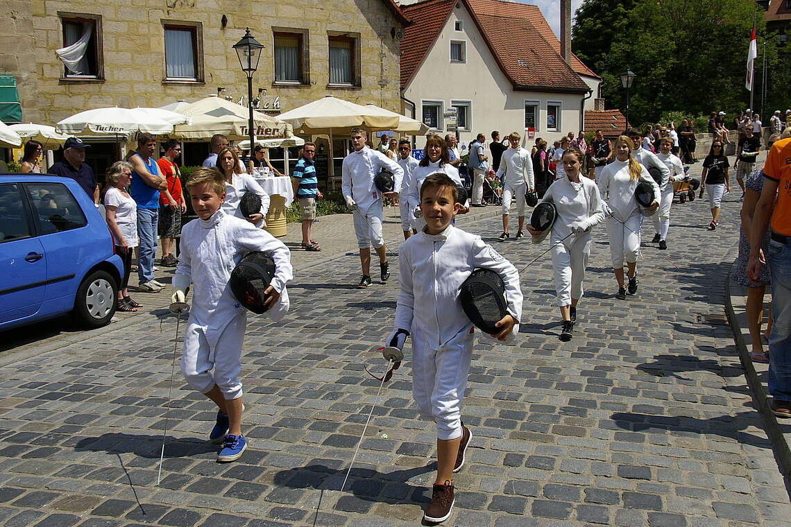 Los ging‘s am Kerwa-Sonntag mit dem Weckruf der Marchingband bei etlichen Honoratioren, überwiegend kommunalpolitisch tätigen Menschen der Stadt. Der Begriff des Weckrufes stammt vom Hornsignal Reveille („Wecken“) welches in militärischen Einheiten zum Aufwecken der Truppen gespielt wird. Der Weckruf wird heute zu Beginn von großen Festtagen veranstaltet und in der Regel von den Geweckten als Ehre empfunden. Schon frühmorgens um 6:30 Uhr standen 35 ausgeschlafene Musiker in Oedenberg und weckten die Bewohner musikalisch auf. Nach den Stationen in Güntersbühl, Nuschelberg, Kuhnhof und Heuchling war der Endpunkt, wie in den Vorjahren auch, die Familie Strasser. Hier wurden die Musiker und gleich auch die mitgelaufenen Fans und die Neugierigen aus der Nachbarschaft am Buffet verköstigt. Es blieb den Spielleuten nur eine kurze Zeitspanne um sich wieder frisch zu machen und umzuziehen, denn Start des großen Festzuges war um 13:30 Uhr. Tausende Laufer bevölkerten die Straßen bei herrlichstem Wetter. Auf Startplatz Nr. 19 zog der Spielmannszug TSV Lauf – Das Original – im funkelnagelneuen Outfit los in Richtung Reigenplatz. Etwas später folgte der gesamte TSV-Tross mit Marchingband, Festwagen, Badminton- und Fechtabteilung. Gerade die Fechter sorgten mit ihren spontanen Kurzvorführungen für Aufsehen.Während die Sportler vor dem letzten, steilen Anstieg zum Kunigundenberg abbiegen durften, rückten beide Musikzüge des TSV weiter nach oben und stellten sich dem Publikum auf dem Kuni-Hill vor. Großer Dank gilt den Helfern beim Festzug, die zuständig waren für die Versorgung der Spielleute mit Getränken und Erfrischungen. Auch kleinere Schwächeanfälle und Blessuren bei den Festzugteilnehmern wurden von ihnen vor Ort sofort und erfolgreich behandelt.