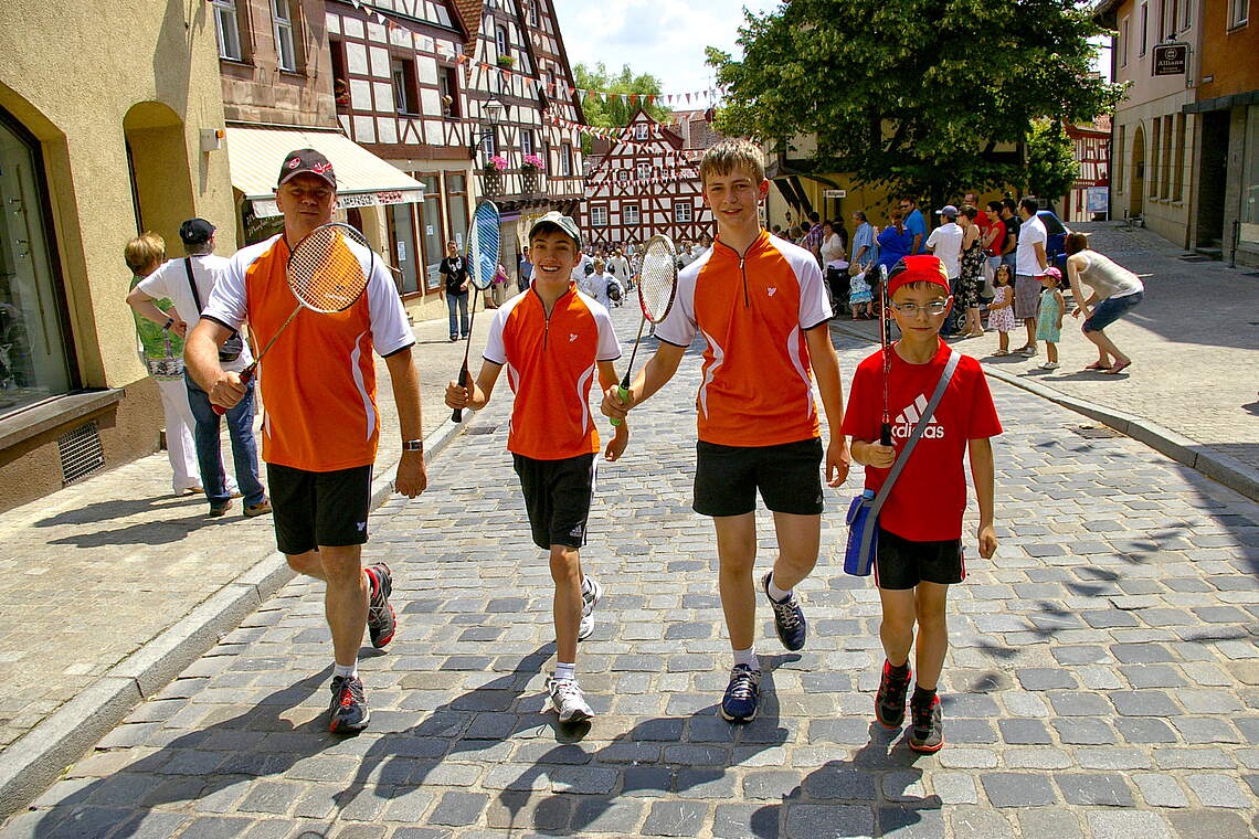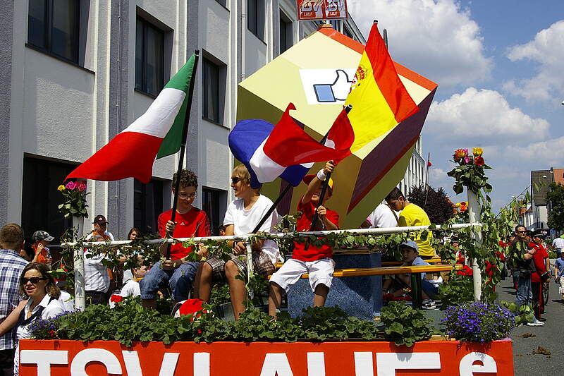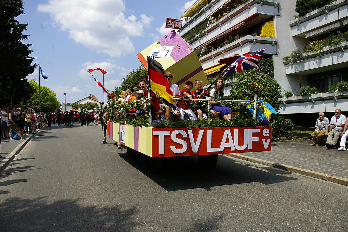 Seit Bestehen des TSV Lauf, und das ist jetzt immerhin 111 Jahre her, findet keine Kunigundenkirchweih ohne massive Beteiligung des Sportvereins statt. In diesem Jahr waren vertreten die Marchingband, der Spielmannszug TSV Lauf - Das Original -, die Badmintonabteilung, die Kinder auf dem Wagen und die Fechter. Die fleißigen Herren im gesetzteren Alter, also die Festwagenbautruppe bestehend aus Helmut Spannekrebs, Artur Flierl, Walter Schiffner und Georg Lage, hatten es wieder punktgenau geschafft und den TSV-Würfel frisch und sehr farbenfroh tapeziert. Das hat voll gepasst, denn das von der Stadt ausgegebene Motto lautete „Freundschaft ist bunt“. Zusätzlich hatten sie das weltweit bekannte Facebook-Zeichen "gefällt mir" mehrfach und mittig auf und am Wagen platziert. Auch das traf ganz genau zu, denn der TSV Lauf hat wieder sehr gefallen und war aufgefallen.