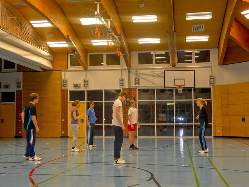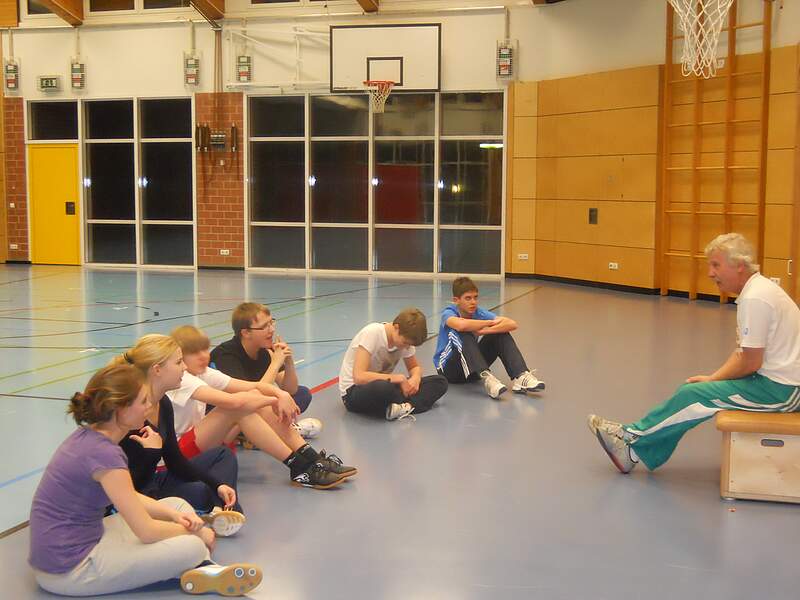 Sechs Jugendliche und ein Trainer in einer großen Halle, man hört nur das leise Geräusch der Turnschuhe auf dem Hallenboden. Koordinationsübung: Ann Katrin hebt und senkt die Arme, streckt sie nach links, nach rechts, vor und zurück, die anderen machen es ihr spiegelverkehrt nach. Drei Mal waren sie schon bei András Szabó, sie mussten dabei auch viel Theorie lernen, heute ist jeder einmal dran, in die Rolle des Trainers zu schlüpfen. Jonas soll die Fechtstellung zeigen, stellt sich korrekt hin:. „Also, das ist die Grundstellung! - Äh, soll ich erklären wie weit jetzt?“ Andràs Szabó: „Ja klar, eineinhalb bis zwei Füße breit, leicht grätschen, linke Ferse nach oben, rechte Fußspitze nach oben!“ Frederick zeigt den Ausfallschritt. Womit beginnt er, wie bewegt er den Fuß, das Bein? Wann erklärt er das? Wie lange müssen seine Fechtschüler im Ausfallschritt bleiben? „Und etzert macht ihr bitte“ –„Nein, Du sagst nicht bittä, du gibst klare Anweisungen! Du darfst die Anfänger nicht so lange im Ausfallschritt stehen lassen, die fallen Dir sonst um!“ Alle sollen darauf achten, dass sie permanent Blickkontakt mit ihrer Gruppe halten.
