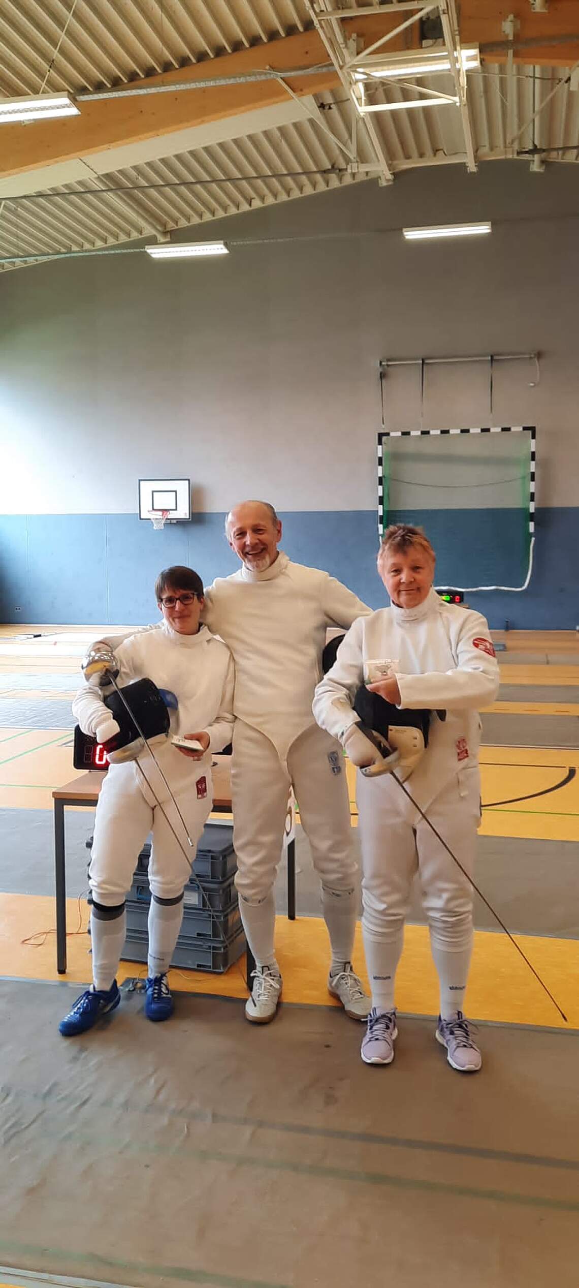Die drei Fechter vom TSV Lauf, Monika Ritter, Jürgen Schrauf und Ellyca Schmidt, starteten in der Altersklasse der Veteranen mit der Fechtwaffe Degen. Die Motivation war groß, auch Dank der Trainerin Heike Matthis! Sie stand während des gesamten Turniers mit guten Ratschlägen zur Seite und freute sich über jeden erzielten Treffer.