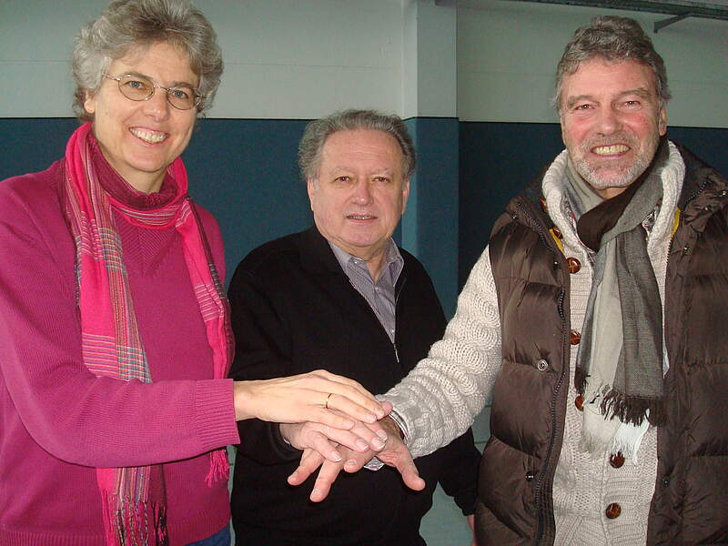 Zum Zeichen einer gelungenen Kooperation für den hoffentlich erfolgreichen Senioren-Fitness-Kurs „Sich bewegen bringt Segen“ reichen sich die Partner die Hände. Mechthild Holzapfel (v. l. n. r.), Freiwilligenkoordinatorin des Caritasverbands, Georg Lage, erster Vorsitzender des TSV Lauf und Kursleiter Werner Pöhler.