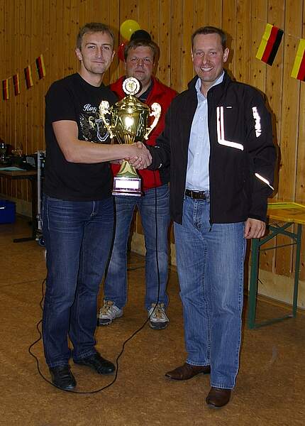 Im Bild gratuliert Landrat Armin Kroder dem Spielführer der Landratsamtelf, Uwe Scharrer. Landrat Kroder hatte den voluminösen Pokal selbst gestiftet und freute sich darüber, dass die Trophäe im 'eigenen' Haus bleibt.