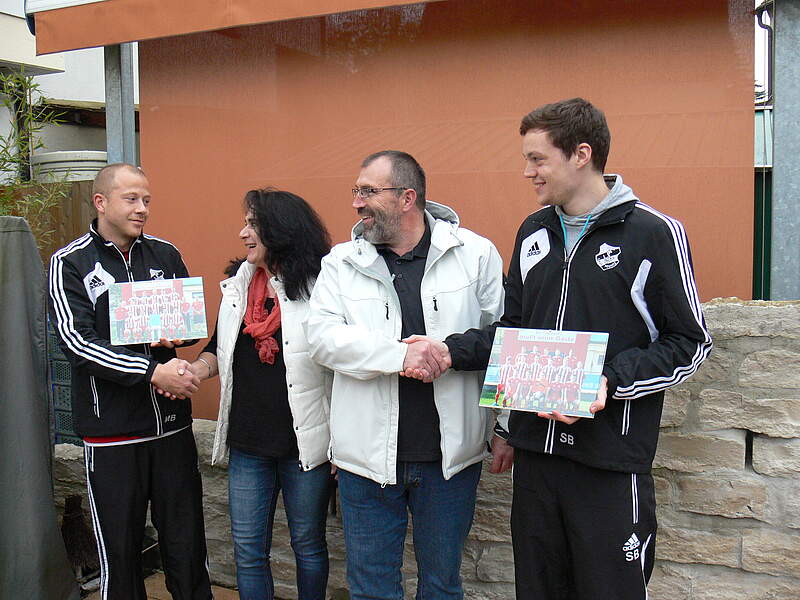 Daher überreichten die beiden Spielführer dem Unternehmer Marcus Lombardia jeweils ein Mannschaftsfoto der beiden Teams im Lombardia-Trikots. Marcus, im Bild mit Lebensgefährtin Kerstin Kemnitzer, zeigte sich gewohnt bescheiden, freute sich aber sichtlich über unseren Dank. Der Unternehmer versprach "seinen" Fußballern daher auch weitere Unterstützung und brachte dies mit einer weiteren großzügigen Spende gleich zum Ausdruck. Danke!