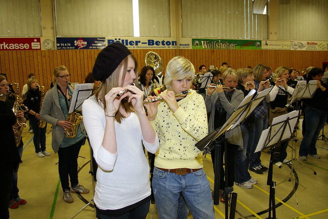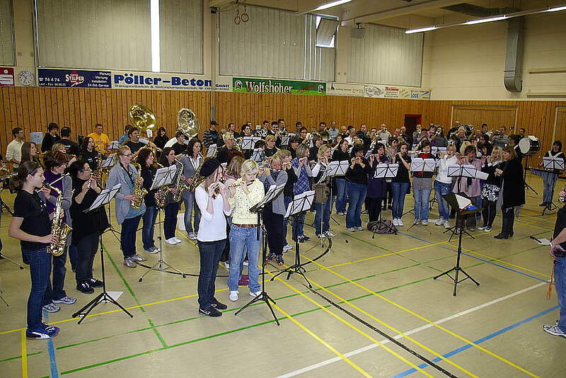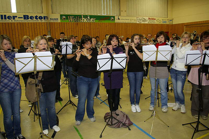 Derweil trat der Hauptzweck der Zusammenkunft, nämlich die Gründungsabsicht, fast in den Hintergrund. Das änderte sich erst, als Schorsch Winter, Dirigent der Marchingband, zu musikalischen Aktivitäten bat, das heißt, er brüllte, um sich Gehör zu verschaffen. Teils mit eigenen, noch vorhandenen Instrumenten und teils mit bereitgestellten Instrumenten zeigten die Spielmänner und Spielfrauen von damals, dass sie überhaupt nichts verlernt haben. Peter Schwarz, früherer Posaunist, hatte gar sein über 30 Jahre altes Marschheft im Original dabei und die Noten aufgeblättert. Die einzelnen Gruppierungen fanden sich wie von selbst in ihren Registern zusammen und formierten sich in gewohnter und selbstverständlicher Art und Weise. Die als Zielvorgabe ausgegebenen Stücke ‚Fehrbelliner Reitermarsch’, ‚Rheinritter Fanfarenmarsch’ und ‚Fanfaren-Dixie’ wurden fehlerfrei, wohlklingend und total überzeugend intoniert. „Unsere früheren Spielleute haben es einfach drauf“ resümierte Schorsch Winter zufrieden. So sahen das auch die Zuschauer und Zuhörer und spendeten begeisterten Applaus.