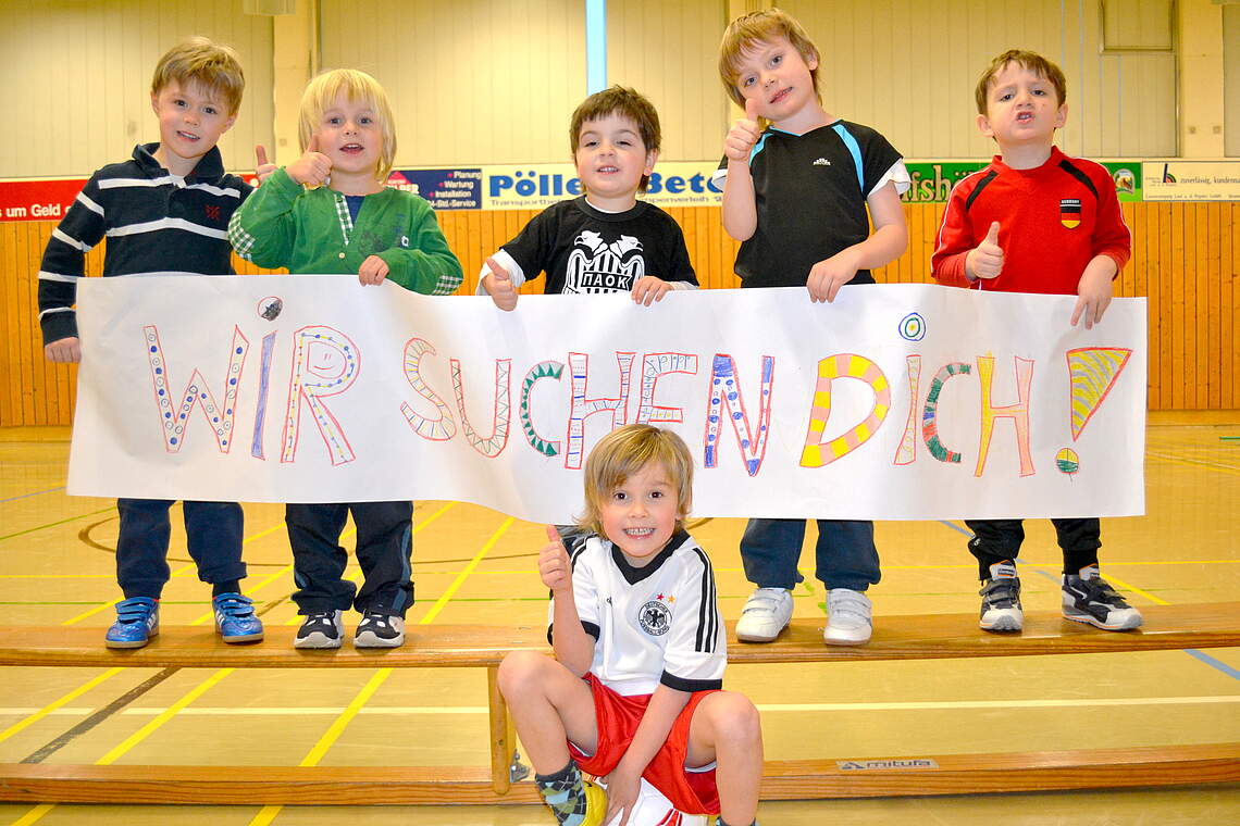 Bei nachmittäglichen Streifzügen durch die TSV-Hallen und Räume trifft man auf die jungen Fußballer im Verein. Die Bambinis (im Bild) sind immer am Dienstag von 16:30 bis 17:30 in der Halle anzutreffen. Und was sich die lustige Truppe wünscht, steht auf dem Plakat. Trainiert werden die Jüngsten von Timo Pesavento und vom Co-Trainer Nil Pesavento. Wer in dieser Gruppe mitmachen will, meldet sich unter der Handy-Nummer 0172 / 44 50 55 7 oder kommt gleich am Dienstag vorbei.