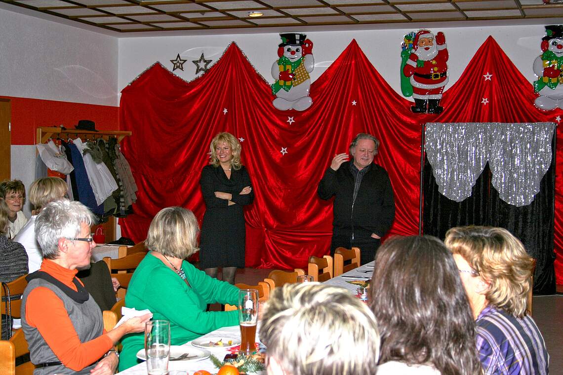 Für die besinnlich-heitere Einlage hatte Manuela diesmal zwei Mitwirkende gefunden: Edith Endler entzückte durch eine Weihnachtsgeschichte in fränkischer Mundart und Karoline Knaudt las eine weihnachtliche Geschichte vor, die in ihrer alten Heimat Berlin spielte. Anschließend nutzte Manuela die Gelegenheit um sich bei ein paar Mitstreiterinnen herzlich zu bedanken: bei Heike und bei mir für unsere tatkräftige Unterstützung in allen Belangen, die die Gymnastik betreffen. Und bei Edith als Kassiererin, die diesen Posten schon sehr lange sehr zuverlässig ausfüllt.