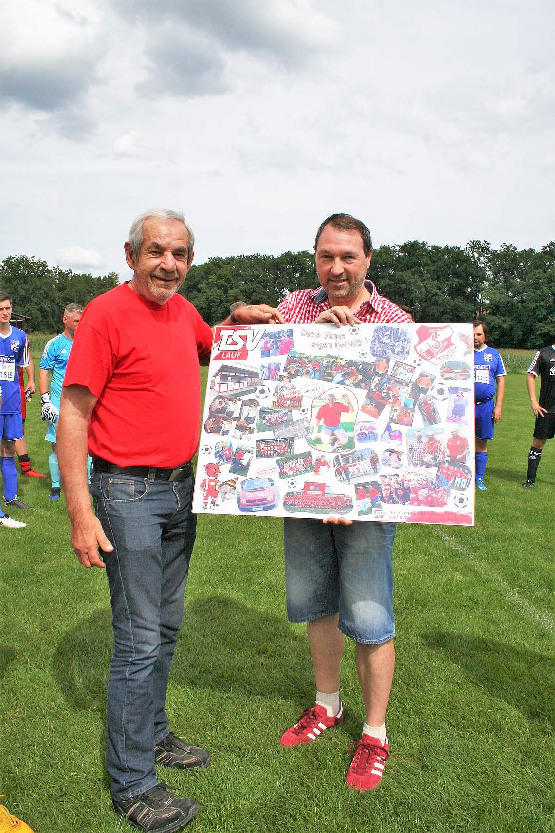 Anlässlich des Rundenauftakts seiner Fußballer verabschiedete der TSV Lauf seinen langjährigen Jugendleiter Fußball, Peter Schreyer, in den Ruhestand. Schreyer leitete über 25 Jahre die Fußballjugend beim TSV Lauf. Er zeichnete in den früher 1980er Jahren dafür verantwortlich, dass der Laufer Traditionsverein seine vernachlässigte Jugendarbeit wieder aufnahm. Das sportliche Comeback der Rothosen trägt mittlerweile auch zahlenmäßig Früchte. Nicht Wenige der im Hintergrund zu sehenden Spieler starteten beim TSV ihre ersten Ballerfahrungen unter der Anleitung von Schreyer, bzw. bei seinen Mitstreitern.
