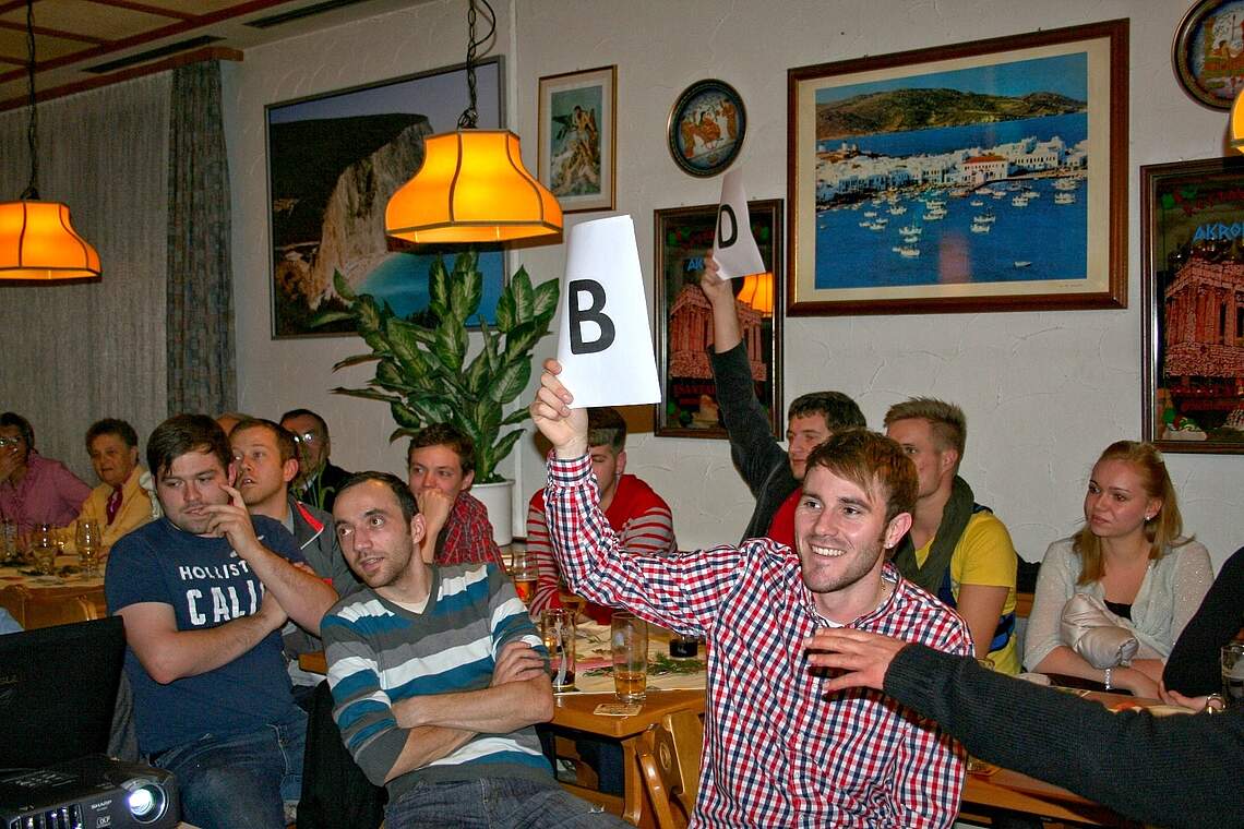 Für den ersten unterhaltsamen Teil des Abends sorgte schließlich wie im Vorjahr unser „Dr. Rock“ aka Frank Schulze (www.dr-rock.info) , der einmal mehr unter Beweis stellte, dass die Fußballer sich auch im musikalischen Metier mittlerweile nicht mehr verstecken müssen. Im Namen der beiden Mannschaften richteten schließlich A.Burkhardt und C.Leniger einige Worte an die Gäste und übergaben den Verantwortlichen die Geschenke aus dem Kreis der Spieler, bevor C.Knell und D.Volkmann die Köpfe aller Anwesenden mit einem Jeopardy-Quiz zum glühen brachten. Erstaunlicherweise war es ein Team aus sehr jungen Spielern unterstützt von unserem H.Teufel, das sich nach Fragen in den Kategorien „Spieler“, „Funktionäre“, „Historie“, „Regelwerk“ und „Kunterbuntes“ gegen alle anderen durchsetzte. Mit dem zweiten Auftritt unseres akademischen Rockers bewegte sich die Stimmung langsam aber sicher in Richtung Siedepunkt, was sich hervorragend mit dem inzwischen angebrochenen 29. Geburtstag unseres langjährigen Stammtorhüters M.Beyer verband. Abgeschlossen wurde der offizielle Teil des Abends wiederum von R.Volkmann, der allen Spielern Funktionsshirts überreichte. Der Dank hierfür gebührt wie jedes Jahr der Familie Schmitt.