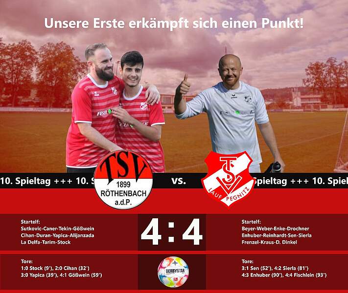 Zum zweiten Mal spielt der TSV Lauf 4-4 und ist heute mit einem blauen Auge davongekommen. Seit nunmehr 7 Spielen sind die Laufer ungeschlagen und stehen nun zum ersten Mal auf einem Aufstiegsplatz.