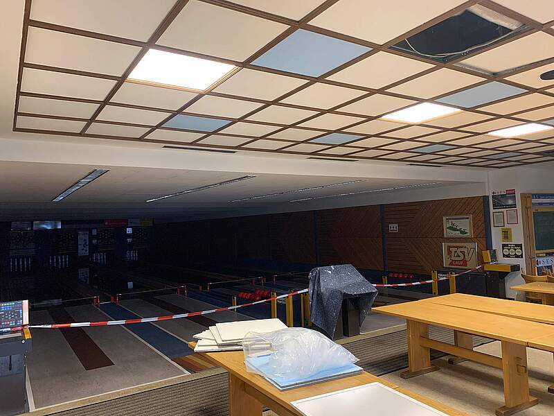 Auch die alte Deckenbeleuchtung wurde erneut und 15 neue Strahler wurde in die Decke eingebracht, so dass nun die Kegelbahn auch in einem hellen Licht strahlend glänzen kann.