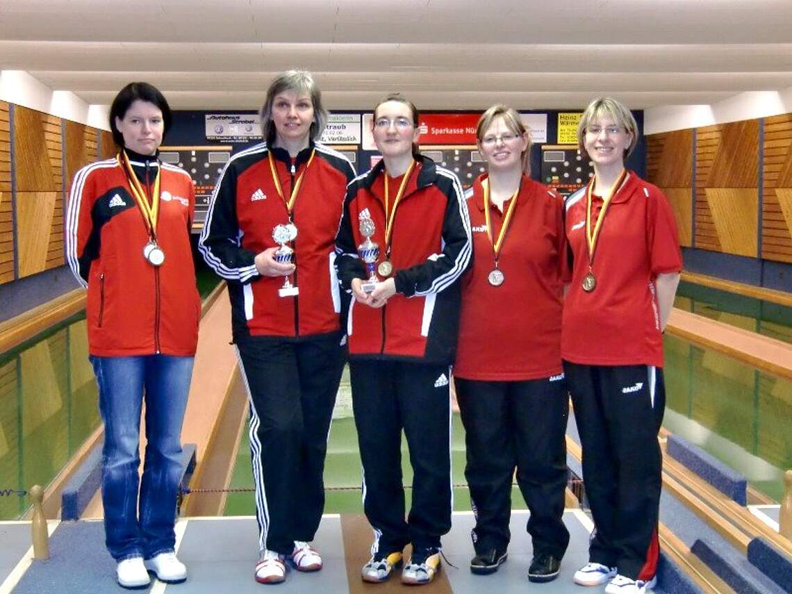 Danach war der Jubel beim TSV riesengroß, hatte man doch tatsächlich das Ziel „Aufstieg“ in die Tat umsetzen können. Wie schon einmal zeichnete sich während der Saison ein Zweikampf mit Abenberg um den Aufstieg ab, den die Lauferinnen diesmal unbedingt gewinnen wollten. Im Gleichschritt erledigten beide Mannschaften ihre Pflichtaufgaben, so dass es am vorletzten Spieltag zum Showdown in Lauf kam. Hier zeigten die Gastgeberinnen eine fantastische Leistung und schickten den Mitfavoriten mit einem Vorsprung von 181 Kegel wieder nach Hause. Das war der entscheidende Sieg um im letzten Saisonspiel in Roth den Deckel drauf zu machen.