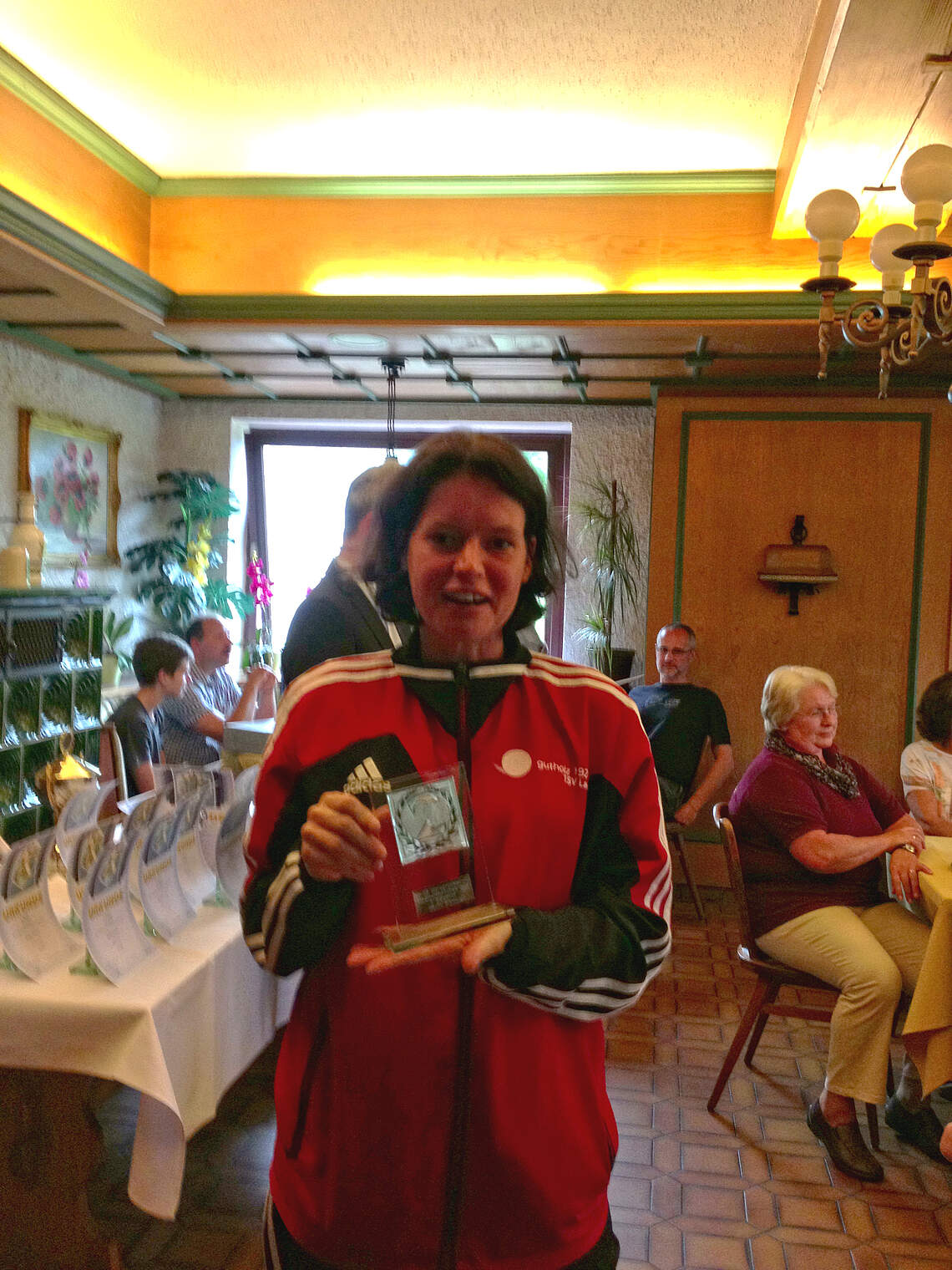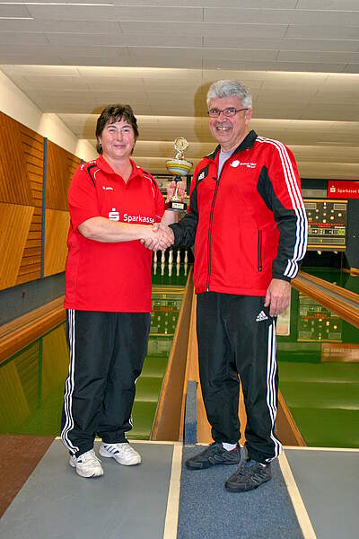 HolzwertungDas Finale bestritten, wie in der vorigen Ausgabe schon angekündigt, Renate Pörsch gegen unsere U18-Spielerin Daniela Bernhard. Renate kegelte sich über ein Freilos und folgende Ergebnisse 479,484 ins Endspiel - Daniela musste dazu drei Gegner bezwingen (454.430,456). Um die begehrte Trophäe zu bekommen mussten nun beide ihre Ausgangsergebnisse von 428 (Renate) und 416 (Daniela) so hoch wie möglich überspielen. Leider blieb Daniela in diesem letzten Spiel mit 393 Kegel das erste Mal unter ihrer Vorgabe. Renate hatte mit 457 Kegel die Nase klar vorn und konnte deshalb den Pokal von Abteilungsleiter Hans Thüringer entgegennehmen.
