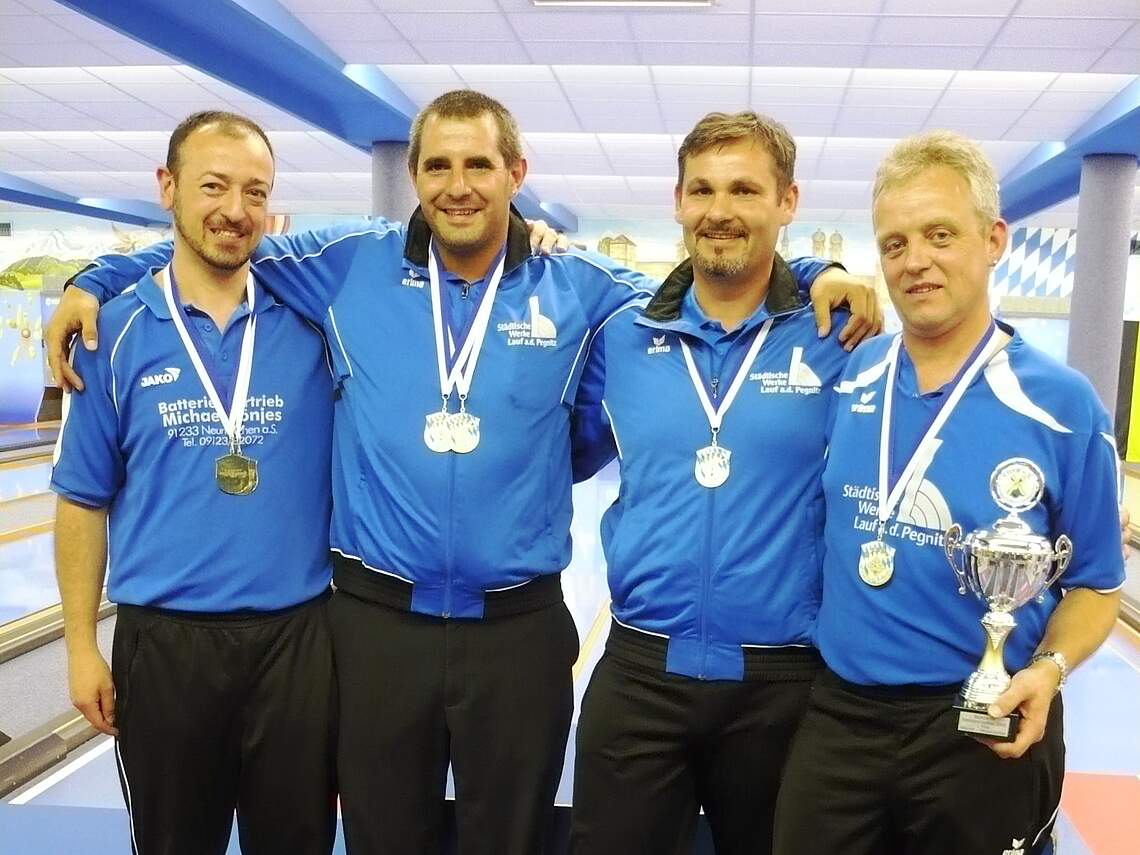 In der Männerkonkurrenz maßen sich insgesamt 32 Mannschaften. Vorrangiges Ziel war hier eine Platzierung unter den Top 8, um einen der begehrten Startplätze bei der Deutschen Meisterschaft in drei Monaten zu erhalten. Doch dazu waren bereits zu diesem Zeitpunkt über 1850 Kegel notwendig. Ähnlich wie bei der Mixed-Mannschaft spielte GH66 einfach darauf los und sorgte für eine sensationelle Überraschung. Hartmut Schmidt überzeugte nachhaltig mit neuer persönlicher Bestleistung von 516 Kegeln. Sein Clubkamerad Anton Heinlein zog mit 478 Kegeln ebenfalls alle Register seines Könnens. Nun lag es an der Schlusspaarung mit Jens Gießwein und Markus Berger, die Steilvorlage zu nutzen. Während Gießwein beim ersten Durchgang (229) noch Startschwierigkeiten hatte, schaltete er beim zweiten Durchgang (280) den Turbo an. Auch Berger konnte mit zwei gleichmäßigen Durchgängen von 256 und 257 Kegeln die 500-er-Marke knacken. Bei dem Gesamtergebnis von 2016 Kegeln kannte der Jubel schließlich keine Grenzen. Damit wurden die Laufer nicht nur unangefochten Bayerischer Meister, sondern überspielten bislang als einziges Team die Grenze von 2000 Kegeln bei einem offiziellen Wettbewerb der bayerischen Breitensportkegler. Das Siegertrio wurde komplettiert von Scharfschieber Obergünzburg (1983) sowie KC Steinhöring (1949).
