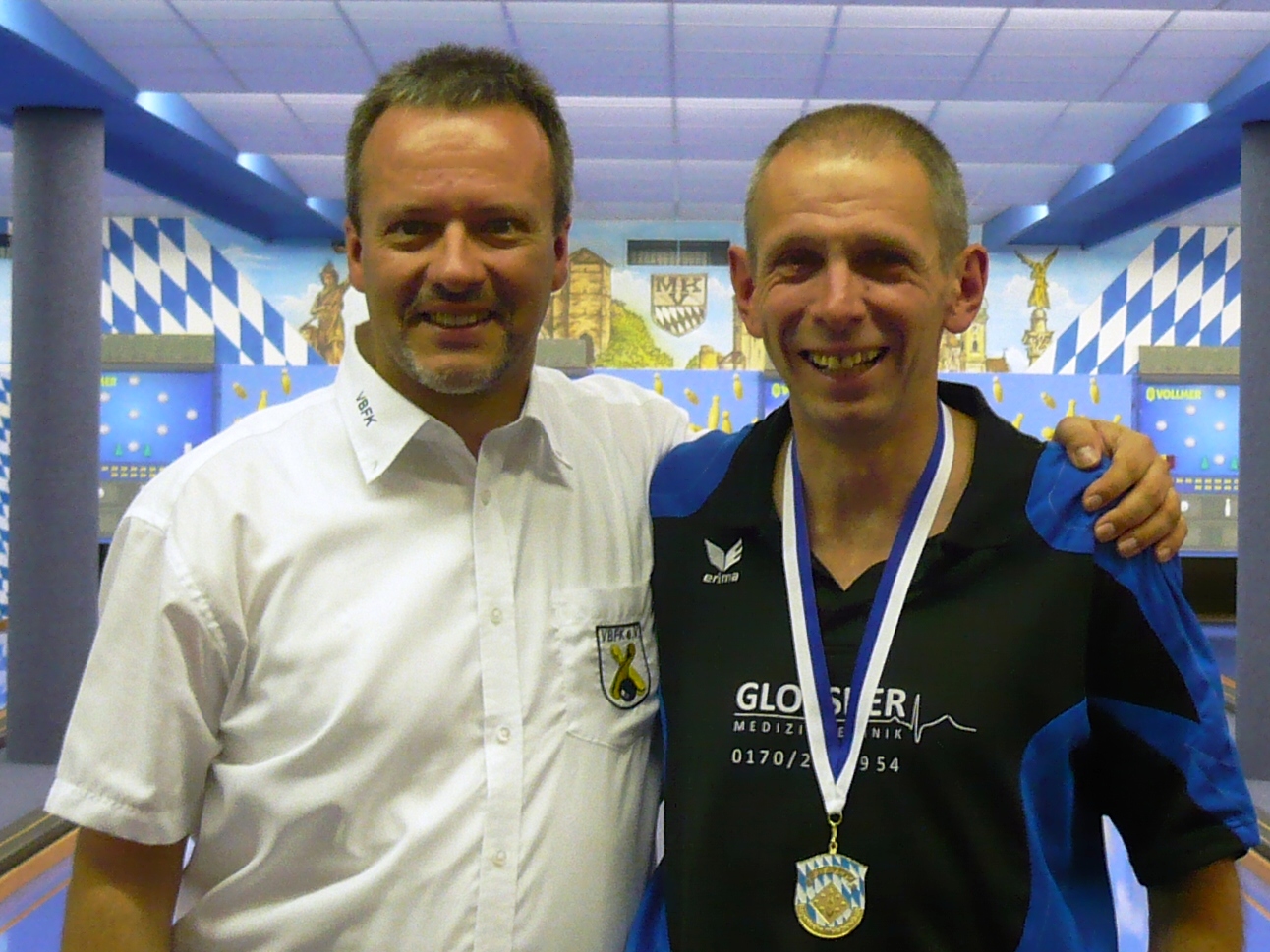 Premiere feierte mit dem Tandem-Paar eine weitere Disziplin, die ab diesem Jahr auch auf Landesebene gespielt wurde. Zugelassen waren 30 Tandems. Zwei Partner in beliebiger Zusammenstellung spielten hier gemeinsam 4 Durchgänge zu je 50 Wurf im kombinierten Spiel (25 Wurf in die Vollen, 25 Wurf Abräumen), wobei sich die beiden Wurf für Wurf abwechselten. Roland Dorsch und Roland Schiffner hatten sich im Bezirk auf Platz 3 für die Teilnahme in München qualifiziert. Routiniert und mit cleverer Spielstrategie holte sich das Paar von Anfang an wichtige Zähler. Am Ende standen 4 überragende Ergebnisse (239, 258, 270, 256) bei einer Gesamtleistung von 1023 Kegeln, was souverän die Führung bedeutete. Doch noch hieß es zittern und den zweiten Spieltag abwarten. Hier starteten unter anderem Marion Gloßner-Fuchs und Markus Berger, die als Erstplatzierte aus dem Bezirk Mittelfranken ebenfalls Titelambitionen anmeldeten. Nach drei vielversprechenden Durchgängen (245, 259, 218) musste der vierte Durchgang verletzungsbedingt aufgegeben werden. Dorsch/Schiffner holten damit die dritte Goldmedaille für Gut Holz 66 Lauf vor Ebert/Haberkorn (989; SKC Glück Auf Waldsassen) und Kiermaier/Kiermaier (989; KC Egmating).