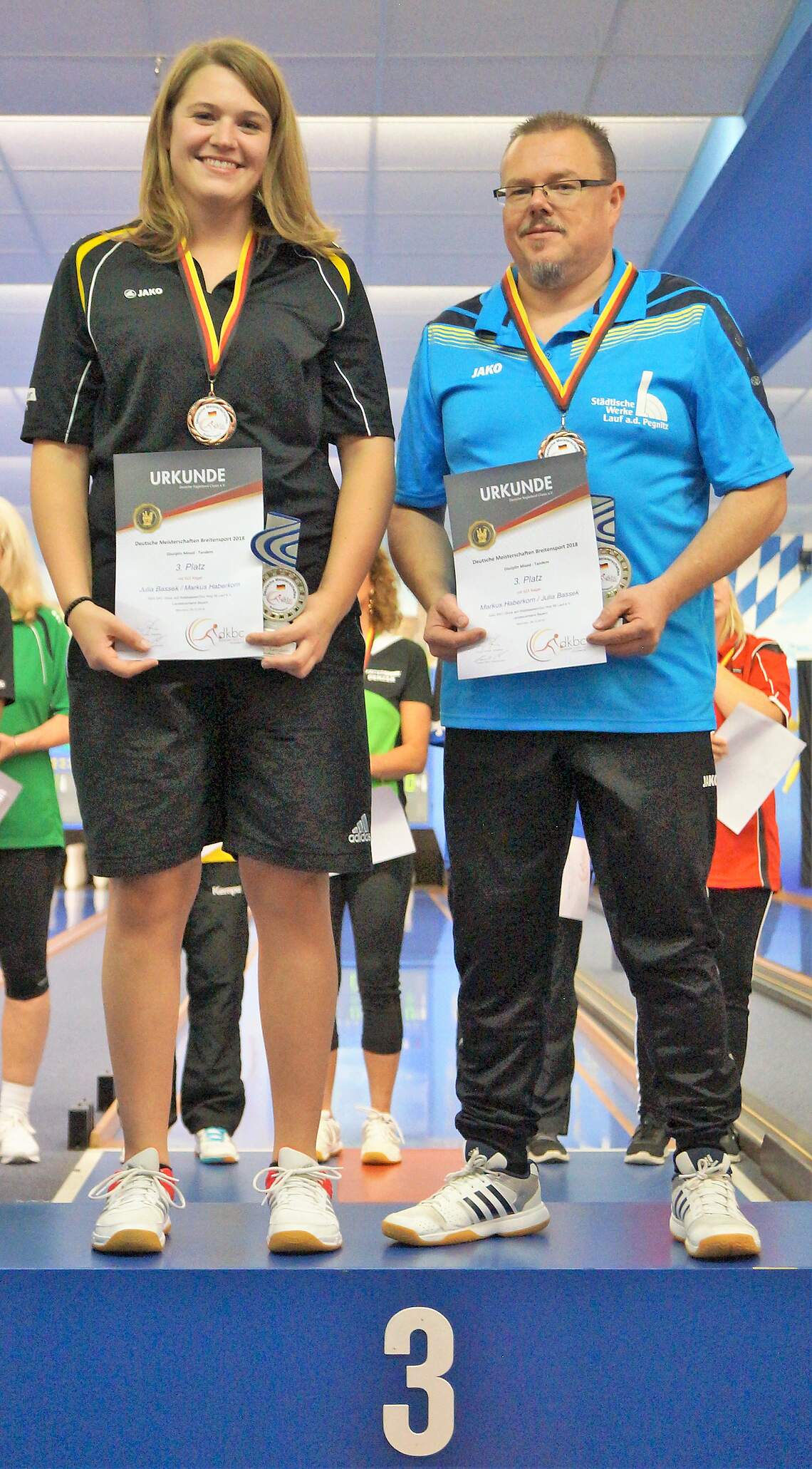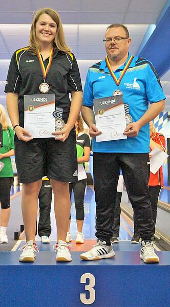 Mit Markus Haberkorn und Julia Bassek (SKC Glück Auf Waldsassen) hatte man noch ein weiteres Ass im Ärmel. Beide gingen als Mixedtandem am frühen Nachmittag an den Start. Die ersten beiden Durchgänge liefen mit 233 und 214 Kegeln eher zäh. Auch nach der dritten Serie mit 207 Kegeln schien eine Platzierung im Mittelfeld besiegelt. Erst am Ende lief das Duo zur Höchstform auf und verzauberte noch einmal mit traumhaften 269 Kegeln. Mit insgesamt 923 Kegeln sicherten sich die beiden schließlich mit der Bronzemedaille noch einen Platz auf dem Siegerpodest.