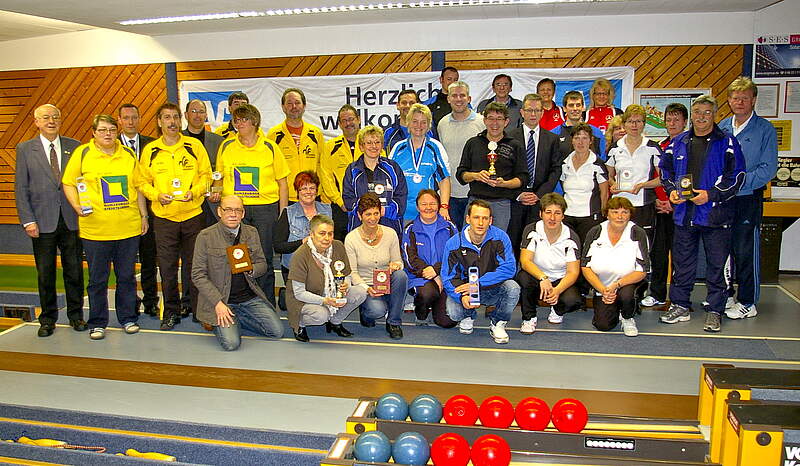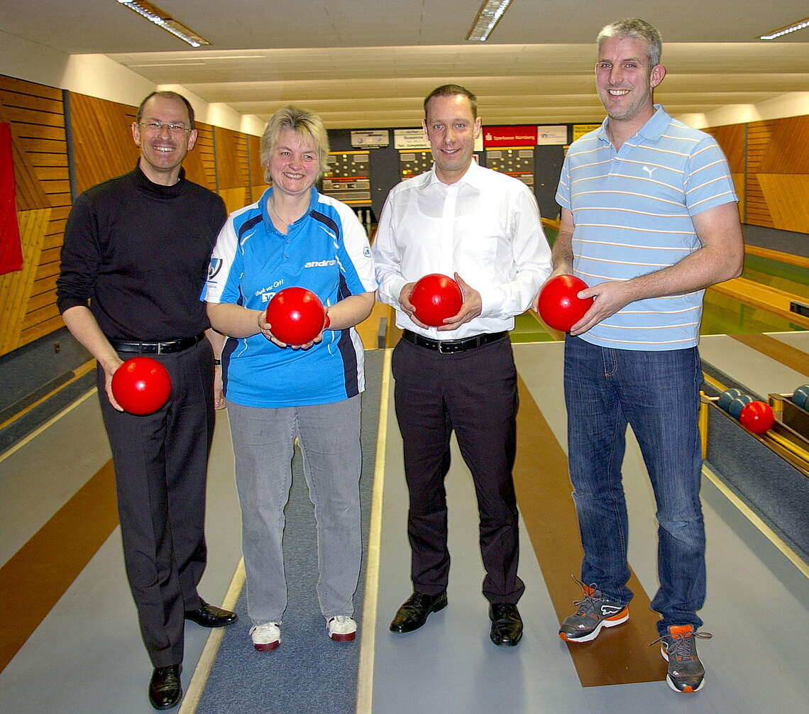 Zahlreiche Ehrengäste waren dem Aufruf des Vereinsvorsitzenden Walter Schiffner gefolgt, dem feierlichen Moment der Siegerehrung beizuwohnen. Für vier von ihnen gab es sogar selbst Medaillen zu gewinnen. So versuchten sich Landrat Armin Kroder, Bürgermeister Benedikt Bisping, Stadtrat Thomas Lang und Tischtennisspielerin Sabine Meier beim „Promi-Kegeln“ über 15 Wurf in die Vollen. Das lautstark angefeuerte Duell entschied Kroder (61 Kegel) vor Lang (56 Kegel), Meier (46 Kegel) und Bisping (40 Kegel) für sich. Neben den Zuschauern waren sich auch die weiteren Ehrengäste Roland Dirscherl (Raiffeisenbank Lauf-Röthenbach), Peter Bauer (Breitensportreferent im DKBC) sowie Georg Lage und Anton Hensel (Vorstandschaft TSV Lauf) einig, dass die 24. Laufer Stadtmeisterschaft erneut ein voller Erfolg war.