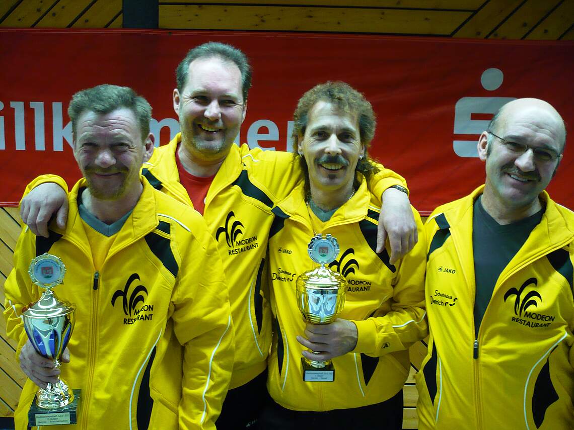 Mit 1149 Kegeln gelang dem Quartett von „Knapp Daneben“ der Titelgewinn mit neuem Rekordergebnis. Dahinter reihten sich Club 77 Neuenmarkt I (1119 Kegel) und Firma Fackelmann III (1100 Kegel) ein.