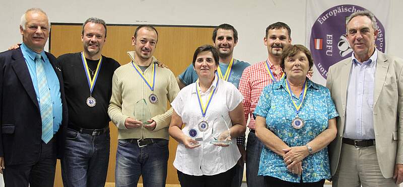 Den Höhepunkt bildete die feierliche Abendveranstaltung, bei der die Gewinner ihre Medaillen und Auszeichnungen erhielten. Leopold Sitz (Präsident der EBFU) und Harald Einwaller (Vizepräsident des VBFKV) ließen es sich nicht nehmen, den Preisträgern persönlich zu ihren Platzierungen zu gratulieren. Das Bild zeigt die beiden Funktionäre zusammen mit den erfolgreichen Laufern und Berchingerinnen.