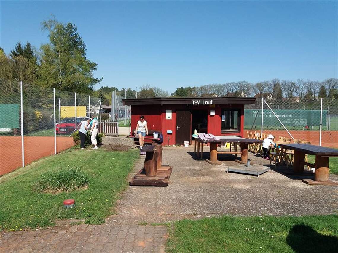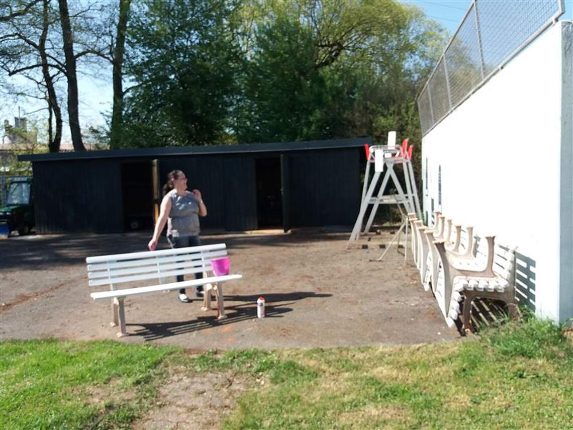 Bei sommerlichen Temperaturen und Sonnenschein machten sich mit Putzeimern und Besen „bewaffnete“ Tennisdamen gutgelaunt daran, „Häuschen“ und Tennisgelände wieder auf Vordermann zu bringen.
