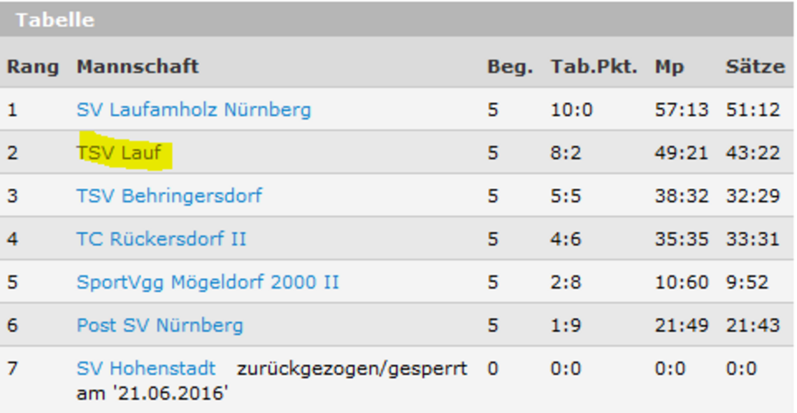 Zuvor gab es doch recht eindeutige Ergebnisse mit 12:2 gegen Rückersdorf, dann ein 11:3 gegen Hohenstadt, 11:3 gegen Behringersdorf und 9:5 gegen Post SV Nürnberg. In den ersten Spielen konnten die Einzel fast immer gewonnen werden, bei den Doppeln sammelten auch die Neulinge erste Medenspielerfahrung.