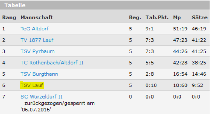 Die Mannschaft musste sich gegen TeG Altdorf, TV 1877 Lauf, TSV Pyrbaum, TC Röthenbach/Altdorf II und TSV Burgthann geschlagen geben. Zu dem Spiel gegen den SC Worzeldorf II kam es leider nicht mehr, da die Mannschaft zurückgezogen wurde.