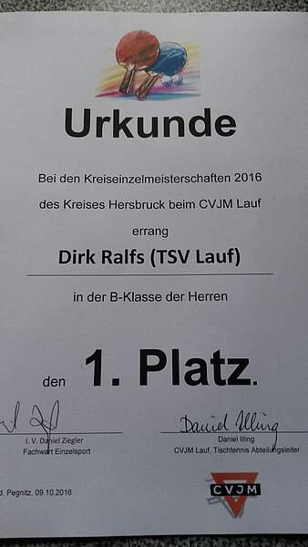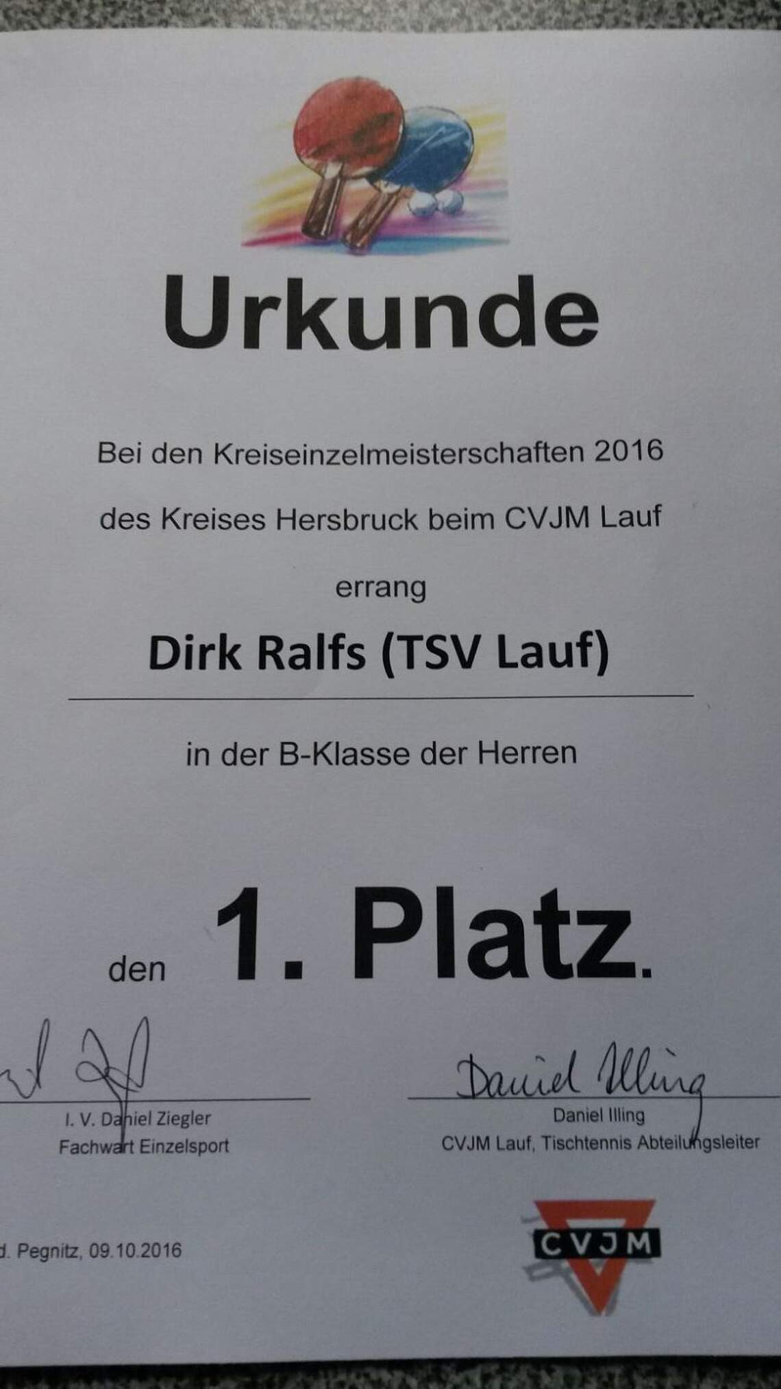 Am 09.10 fanden für die Jugend beim TV Altdorf die Kreiseinzelmeisterschaften und für die Erwachsenen beim CVJM Lauf statt. Bei beiden Turnieren war der TSV Lauf vertreten. In der Herren B Klasse traten Dirk Ralfs und Sebastian Pietrzak an.