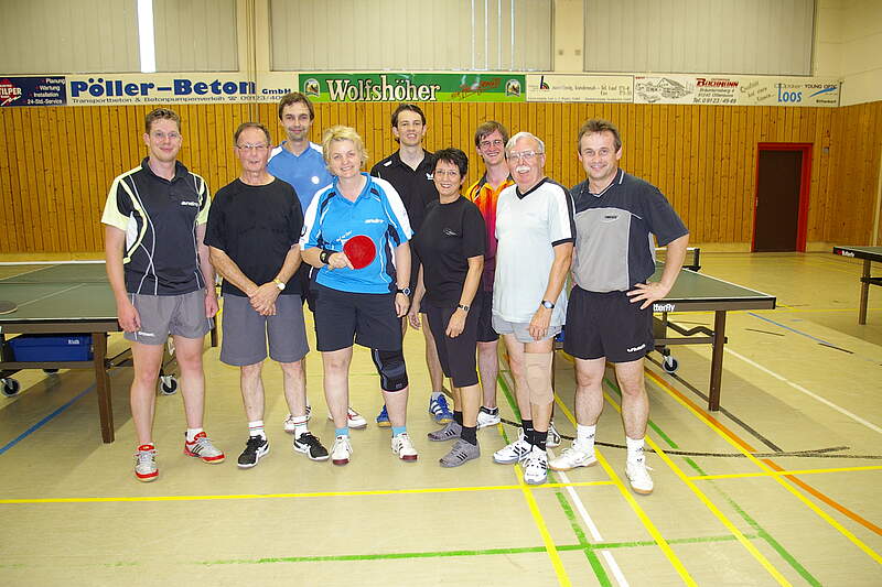 Von ihrer Tischtennispartnerin und Herren der Tischtennisabteilung wird die strahlende, mehrfache Deutsche Meisterin Sabine Meier eingerahmt. Im Bild v.l. Florian Heckel, Günther Wohlfarter, Markus Bauer, Sabine Meier, Andreas Bohrer, Uschi Pickl, Christoph Schmidt, Gustav Paschke und Abteilungsleiter Thomas Godek