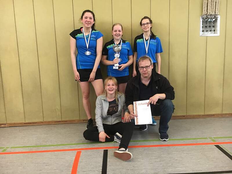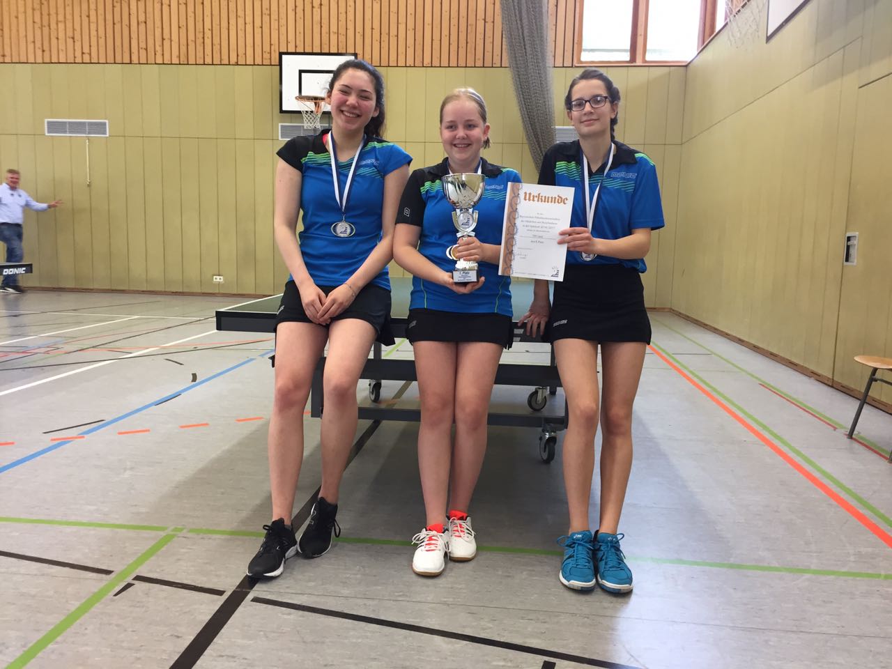 Nach zwei Auftaktniederlagen von Andrea und Katharina konnte Alexandra einen Fünfsatzerfolg feiern. Im Anschluss konnte Andrea an diesen Erfolg leider nicht anknüpfen und schon lag der TSV mit 1:3 in Rückstand. Eine Klasse Leistung von Alexandra, Katharina und dann wieder Alexandra ermöglichte eine kurzzeitige 4:3 Führung, die aber nicht lange halten sollte. Und so ging es im Finale, wie auch schon in der Partie davor, in das entscheidende Match. Nach einem sehr souveränen Satz von Katharina ging der zweite Satz prompt weg und es schien noch einmal eng zu werden. Doch Katharina agierte in den Sätzen drei und vier sehr souverän und konnte dieses Spiel gewinnen und damit auch den fehlenden Punkt holen. Folglich feierten die Mädels ausgelassen ihren Erfolg und den Titel Bayerischer Pokalmeister auf Bezirksebene der Mädchen in der Saison 2016/2017.