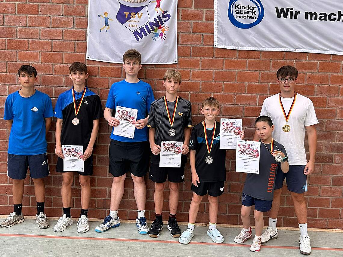 Parallel zum zweiten Turniertag der TOP 14 fand in Winkelhaid ein Qualifikationsturnier für die Bezirksmeisterschaft statt, das in drei Leistungsklassen ausgetragen wurde. Für den Laufer SV gingen Maximilian Schuster, Dominik Drzymalla, Mica Hartmann, Yasin Düzenli, Clemens Kupper und Felix Zhu an den Start. Die Jugendlichen traten zum Teil gegeneinander an und zeigten bereits ab dem ersten Ballwechsel ihre gute Form. So machten die Laufer den Sieger der Leistungsklasse 1 unter sich aus: Maximilian gewann alle sechs Spiele und verwies Mica (5:1) auf den zweiten sowie Dominik (4:2) auf den dritten Platz. Yasin blieb trotz guter Leistung mit 1:5 Spielen in der Klasse 1 unter seinen Möglichkeiten. In der Leistungsklasse 3 erreichte Felix mit 4:2 Spielen den zweiten Platz, und Clemens erspielte sich in Klasse 4 mit 5:1 Spielen ebenfalls die Silbermedaille.